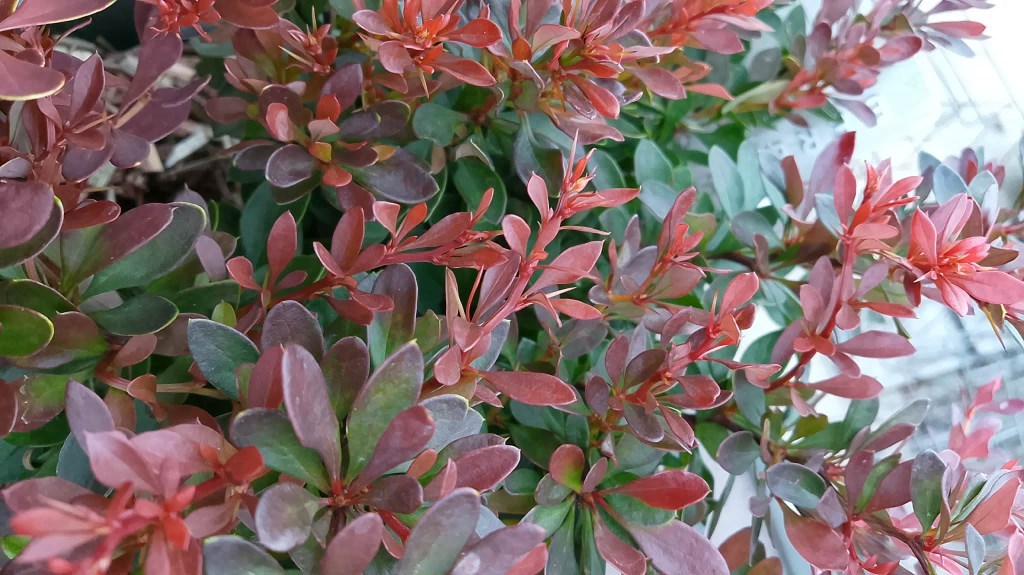 Blad: Små, ovale blader med klar rubinrød farge hele sommeren, som intensiveres ytterligere om høsten.
