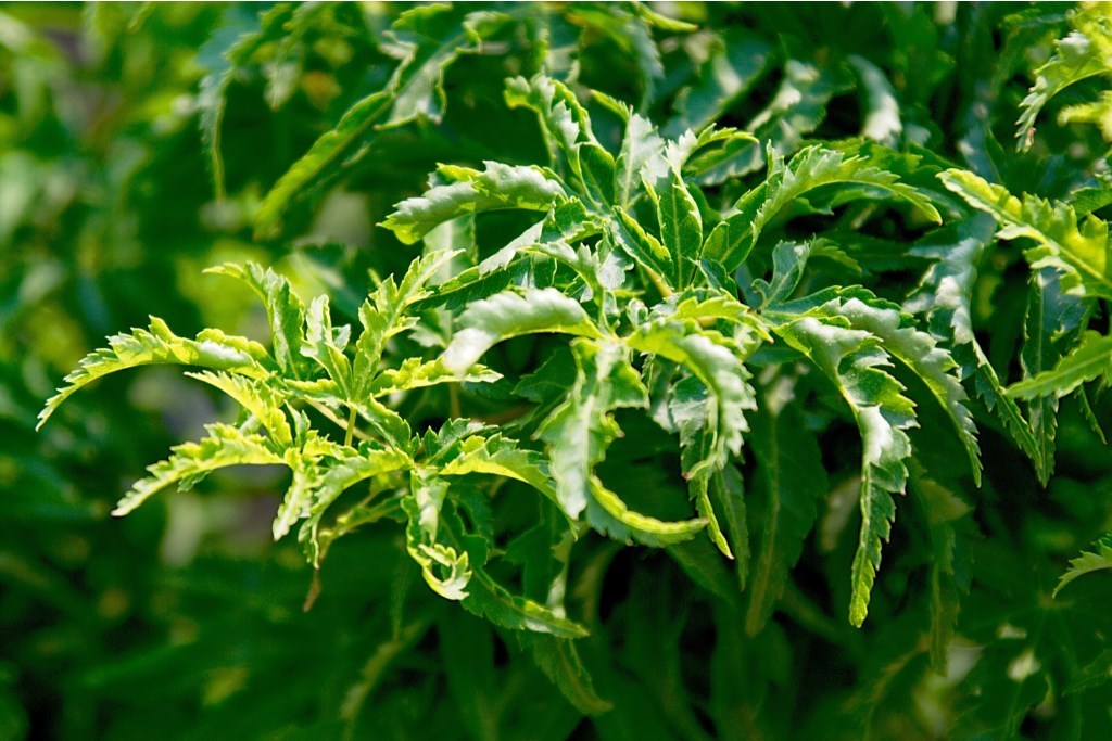 Bladene til "Shishigashira" er små og tett pakket på grenene. De er mørkegrønne om sommeren og får en vakker rødlig farge om høsten. Bladene har en bølgete tekstur og gir et attraktivt utseende til planten.