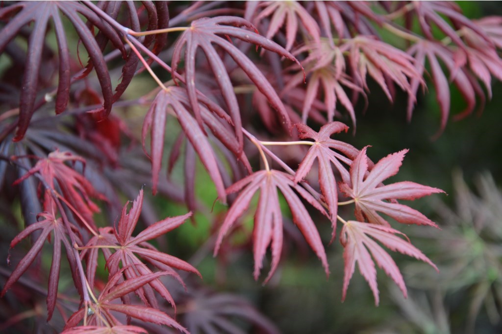 • Bladverk: Unge blader er intens røde om våren, blir mørkere rødgrønne om sommeren og får igjen skarp rød høstfarge. Bladene er dypt flikete og gir et dekorativt, strukturert uttrykk.