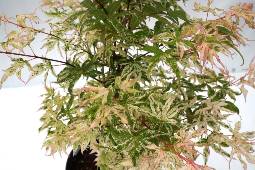 En fascinerende variant av japansk lønn. Bladene er brokete. Om våren er de først lys grønne med hvite flekker, og en lys rosa kant.Etterhvert forsvinner den rosa kanten. Om høsten får den flotte guloransje farger. Sentvoksende og kompakt (opp mot 2-3 meter) Velegnet til krukker. Vinterherdighet H2