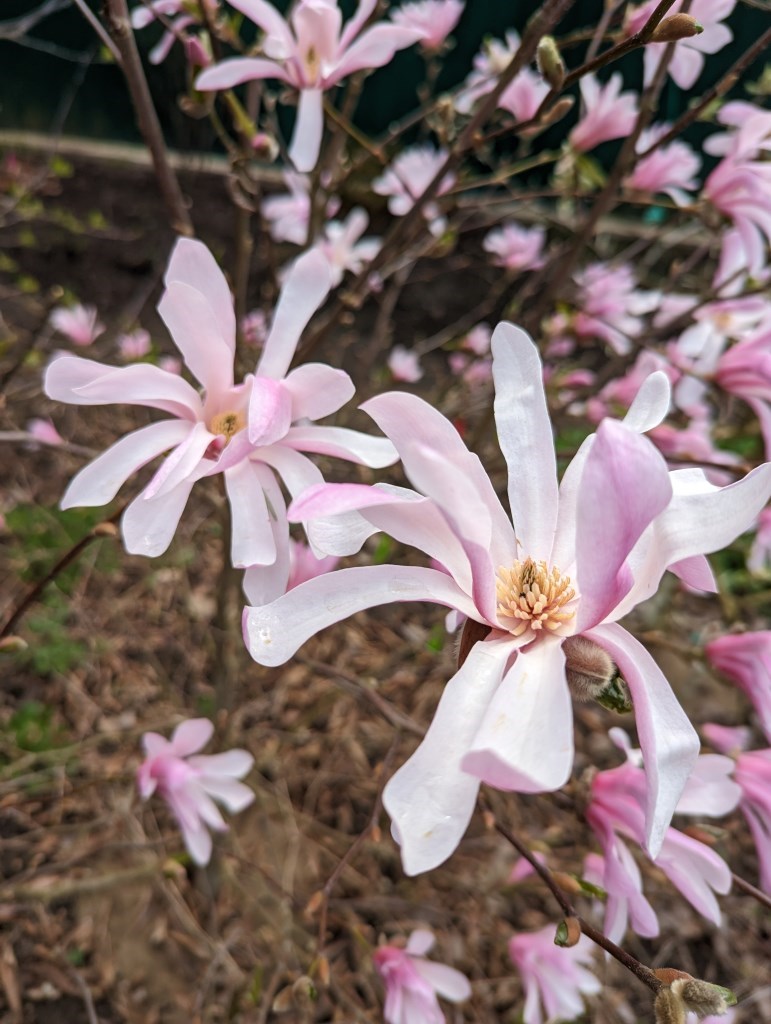 Blomster: Stjerneformede, rosa (mer intens rosa enn de hvite variantene), med mild duft. Blomstrer tidlig på våren før bladene kommer. Hver blomst har 12–18 smale kronblader, som gir et delikat, luftig utseende.