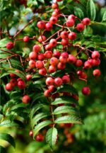Oransjerosa Rogn – Friskt og frodig lite tre. Kan bli 4 meter høy. Hvite blomster i juni. Oransjerosa bær.