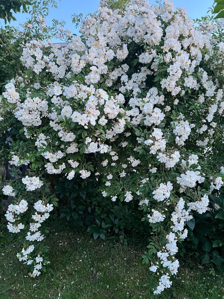 Blomster: Små til middels store, halvfylte kremhvite blomster med en svak gul kjerne. De dufter intenst og minner om honning.