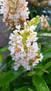 Buddleja Butterfly Candy ‘Little White’ er en kompakt sommerfuglebusk med vakre, hvite blomster og en blomstring som tiltrekker pollinatorer som sommerfugler og bier.