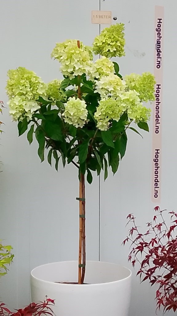 Hydrangea paniculata 'Skyfall' er en imponerende syrinhortensia med store, tette blomsterstander og et elegant uttrykk. Som oppstammet variant får planten et stammehøyde-podet uttrykk med en luftig krone, perfekt for små hager, krukker eller som solitærplante.