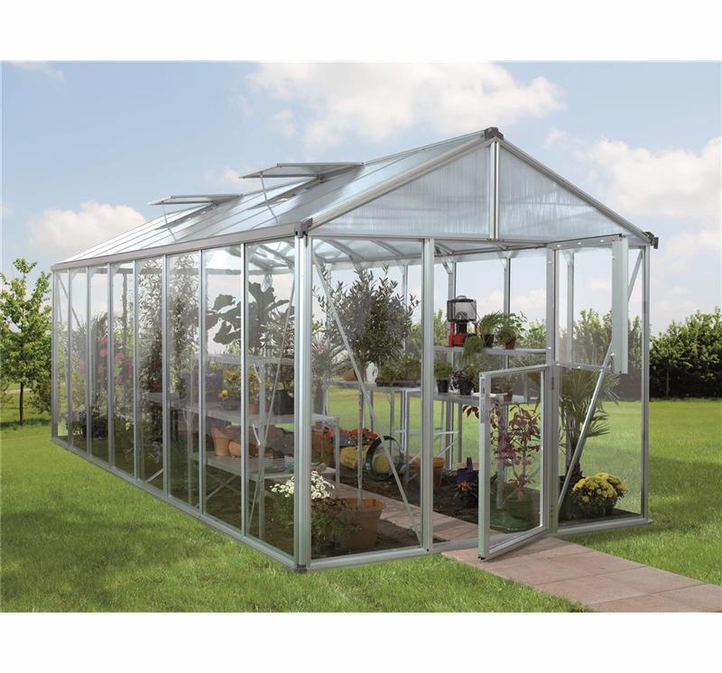 Semi-profesjonellt veksthus med ekstra lange glassvinduer. 5 størrelser tilgjengelig (8.1m2 til 15.7m2). Herdet side glass og 10mm polycarbonat takplater. Tilgjengelig i eloksert aluminium og pulverlakkert svart.